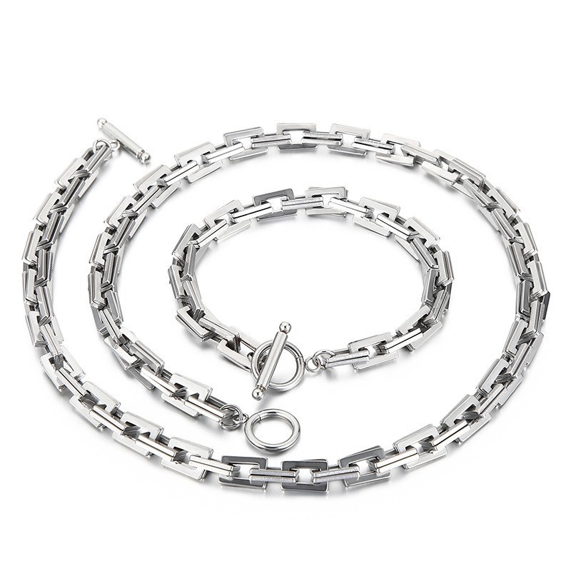 European and American Classic Fashion Cuban Thick Chain Square Corner Splicing Necklace Personalized Trendy Bracelet Stainless Steel Jewelry Set