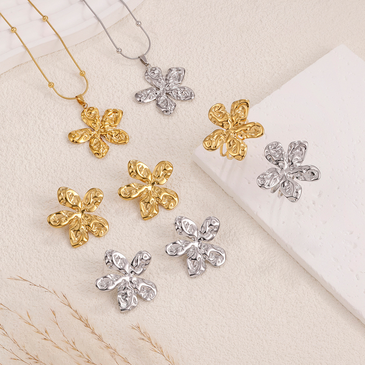 European and American Cross-Border Baroque Style Stainless Steel Oil Pressure Flower Metal Necklace Earrings Ring Jewelry Set