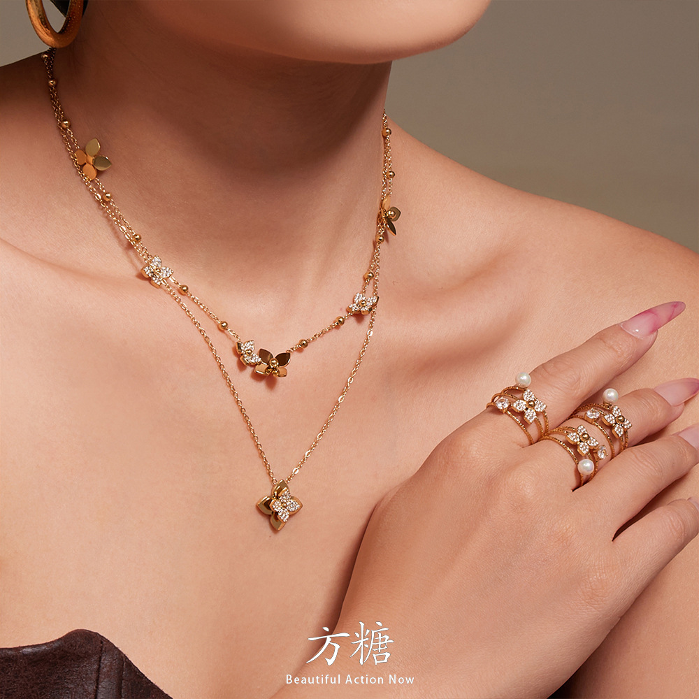 Sugar Cube Elegant Accessible Luxury Niche Four-Leaf Clover Flower Pendant Necklace Design Micro-Paved Zircon Shell Bead Ring Set