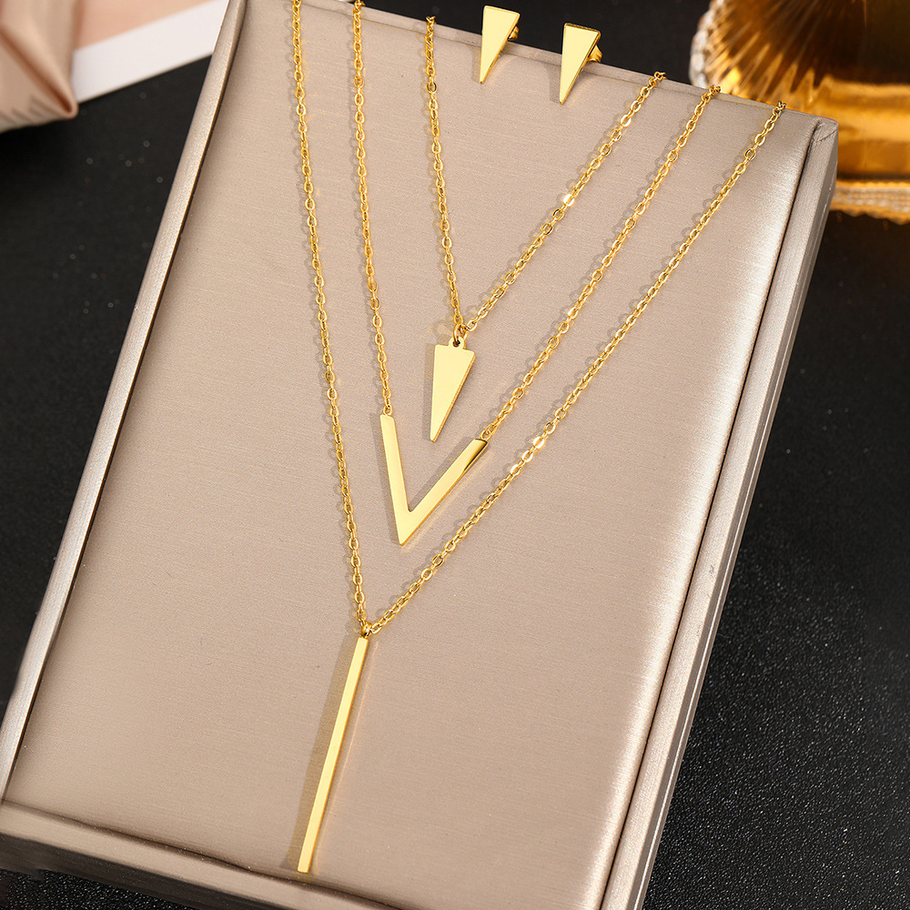 Stainless Steel Geometric Three-Dimensional Triangle Rectangular Pendant Necklace Earrings Jewelry Set Exquisite Fashion Jewelry for Women