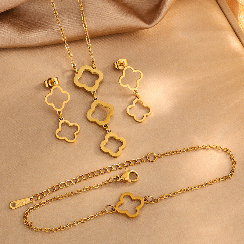 Cross-Border Hot-Selling Hollow Four-Leaf Clover Necklace, Bracelet, Earrings Set, Fashionable Commuting Stainless Steel Jewelry, Dropshipping