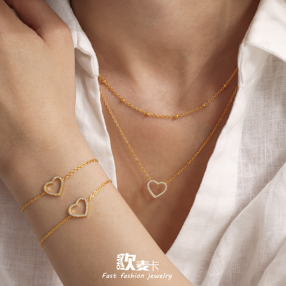 Ou Maika Stainless Steel Full Diamond Love Zircon Double Layer Fine Clavicle Necklace with Color-resistant Textile Bracelet for suit Women