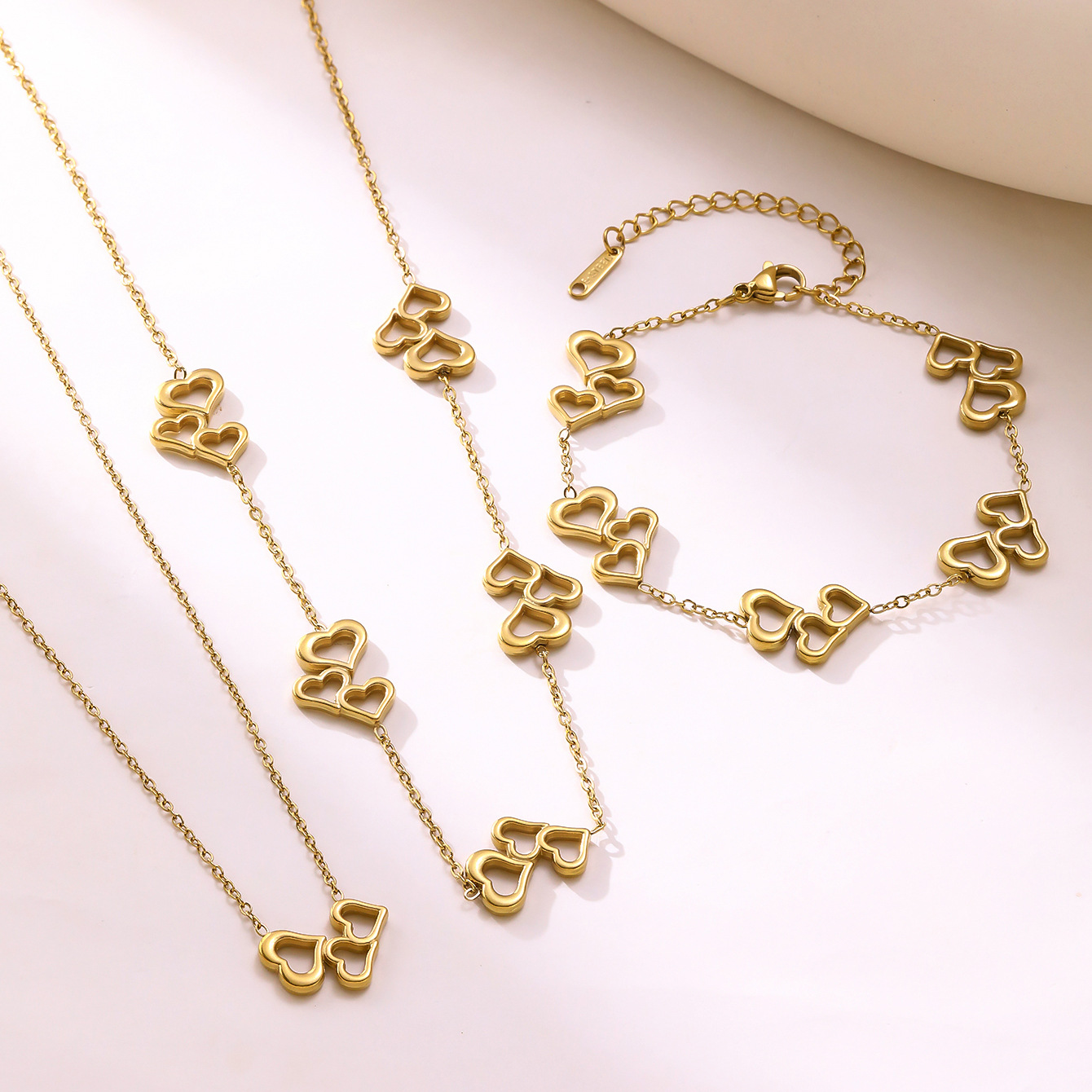 New 304 Stainless Steel Three Heart Bracelet Necklace Plated with 18K Gold Non-Fading Fashionable Versatile Cut Out Jewelry Set