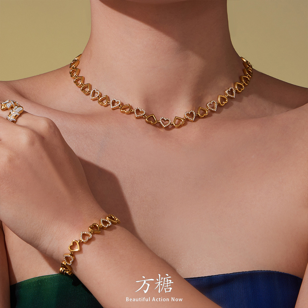 Sugar Cube Cross-Border New Stainless Steel Full Diamond Heart Handmade Chain Necklace Bracelet Set Plated with 18K Real Gold Jewelry