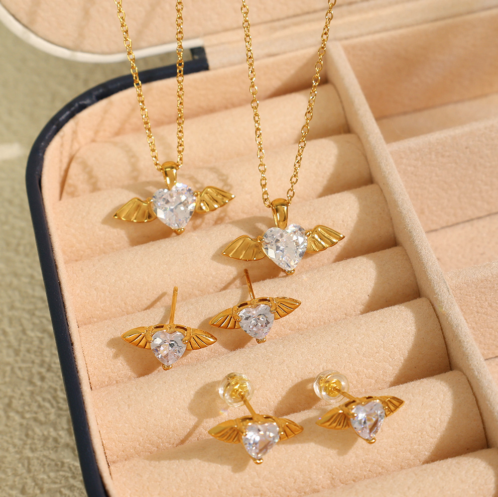 European and American Hot-Selling Heart-Shaped Zircon Angel Wings Pendant Necklace Earrings Simple Titanium Steel Plated 18K Jewelry Set