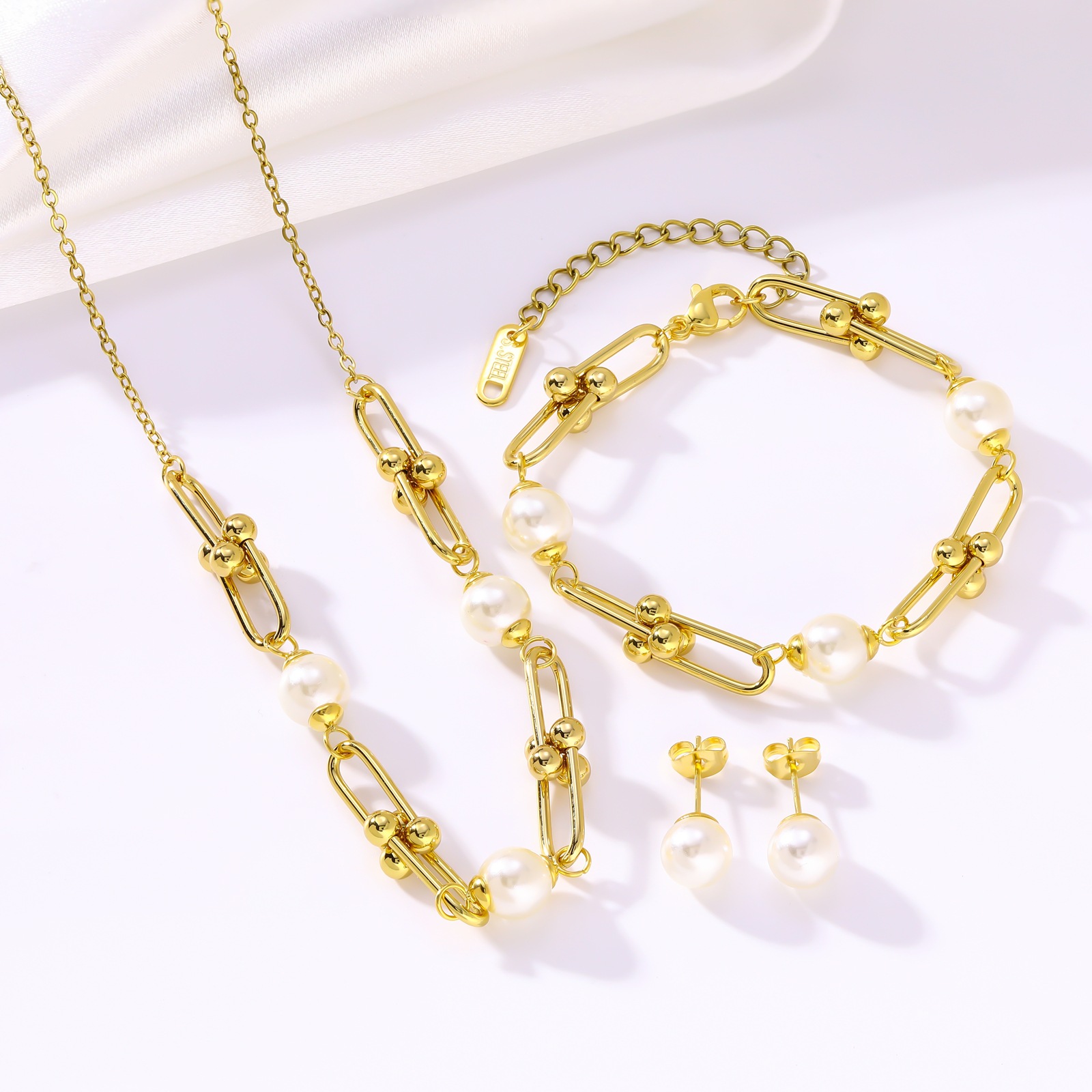 French-Style Light Luxury Retro Stainless Steel Horseshoe Pearl Set for Women, Elegant and Sophisticated Beaded Pearl Set, Niche