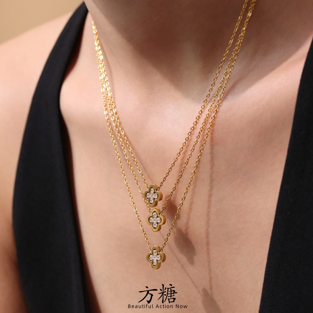 Sugar Cube Stainless Steel Four-Leaf Flower 5A Zircon Earrings Necklace Set European and American Fashion Versatile 18K Real Gold Plated Jewelry