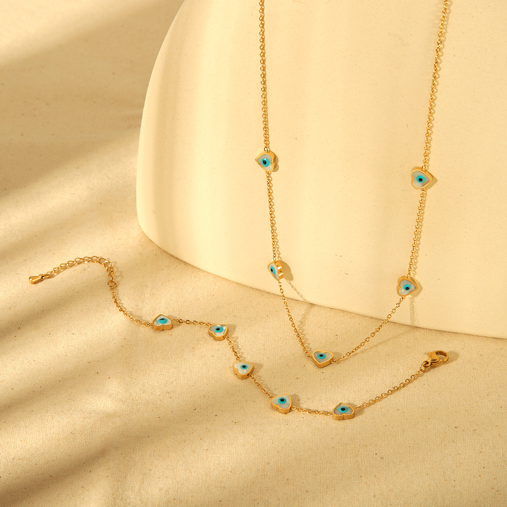 Amazon Cross-Border Hot Selling Oil Dripping Devil's Eye Peach Heart-Shaped Bracelet Necklace 18K Gold Plated Stainless Steel Set for Women
