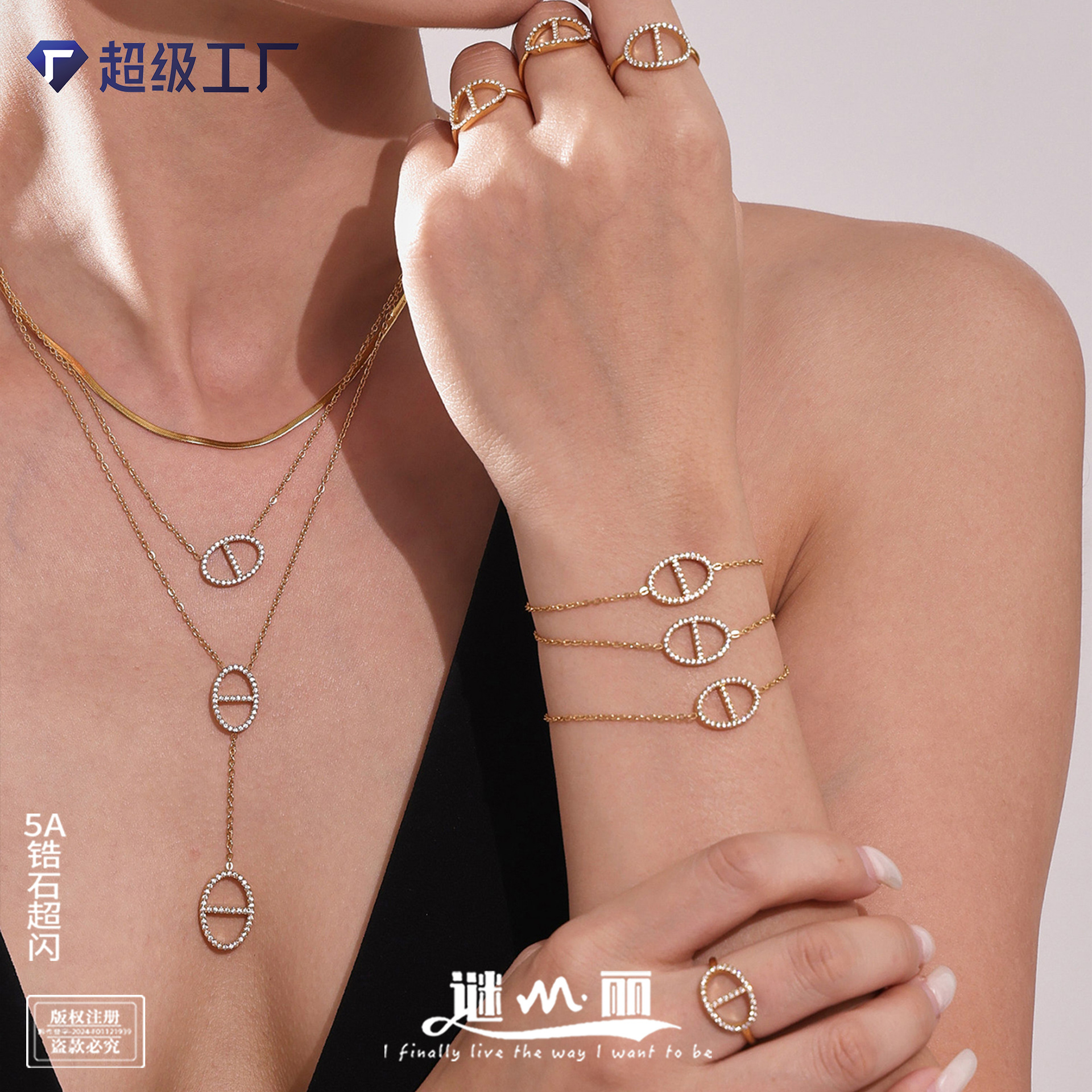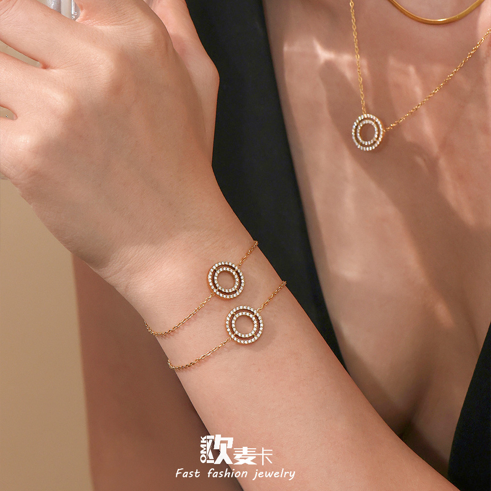 Omaca Super Flash 5A Zircon Circle Pendant Clavicle Necklace Bracelet Niche Design Stainless Steel New Set