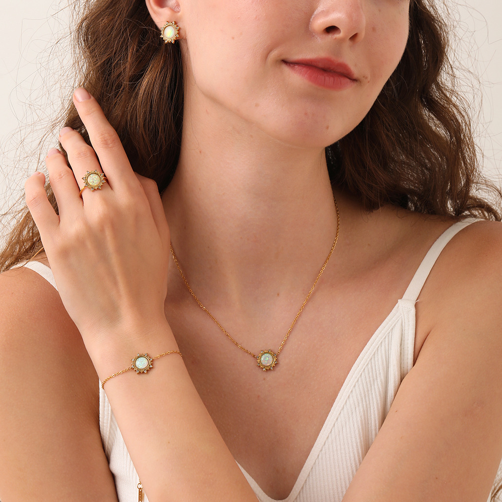 European and American Fashion Vintage Necklace Bracelet Earrings suit Stainless Steel Plated 18K Gold Ao Gem Round Sun Necklace Women