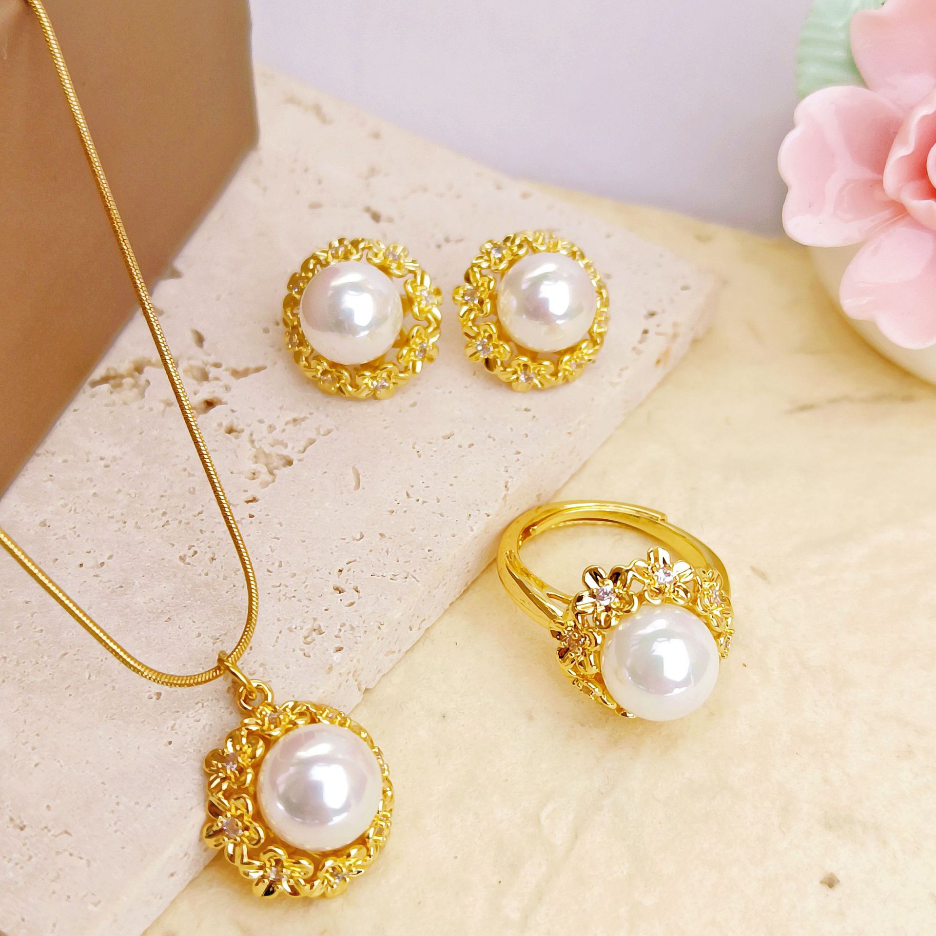 Titanium Steel High-End Women's Zircon Sunflower Jewelry Stainless Steel Set Pearl Earrings Ring Necklace Non-Fading Jewelry