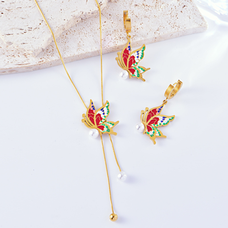 Summer New Chinese Color Butterfly Pearl Tassel Necklace Oil Dropping Ear Ring Buckle Clavicle Chain suit Holiday Style Accessories