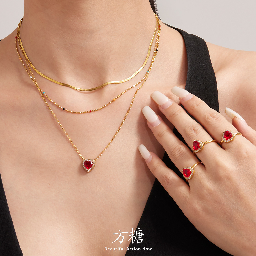 Sugar Cube Super Flash Peach Heart Red Zircon Necklace Earrings Ring Titanium Steel Plated 18K Gold Accessible Luxury Jewelry Set for Women
