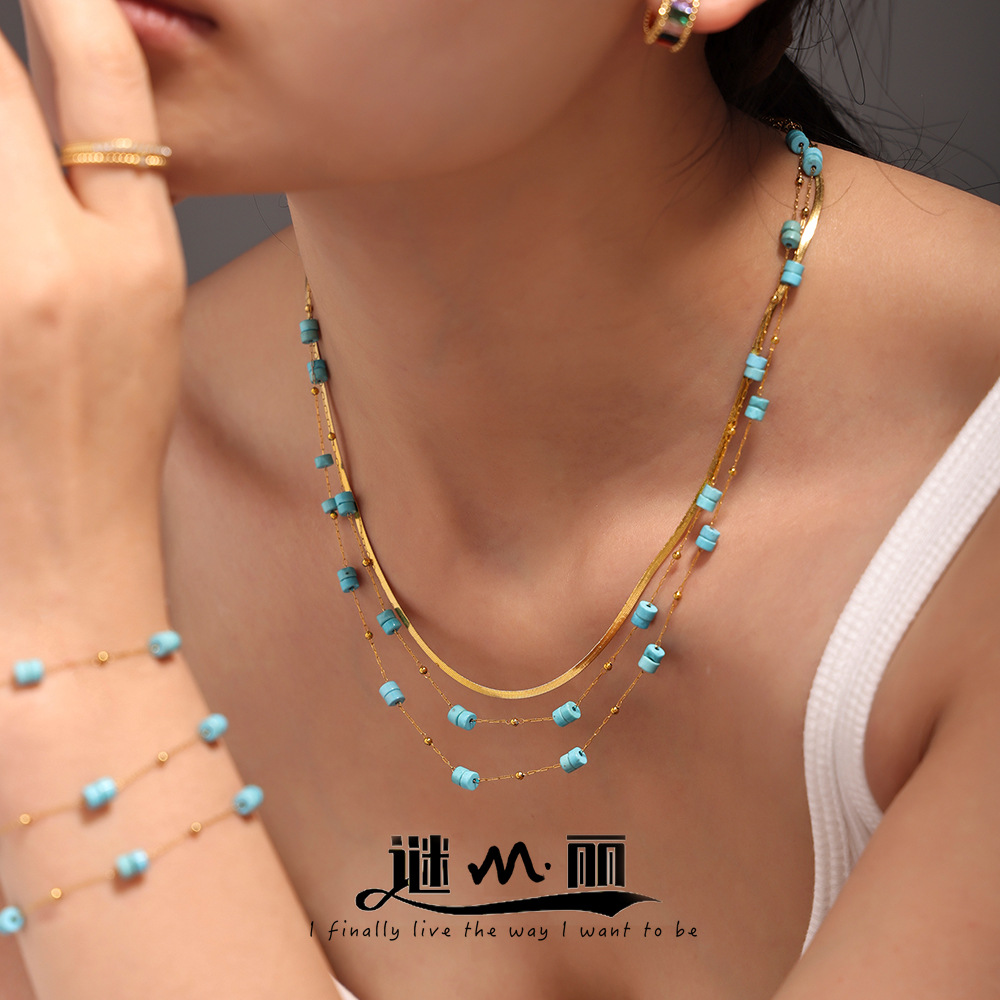 Enigma Li Gold Bead Cylindrical Blue Turquoise Handmade Necklace Bracelet Double Layer Stacked Wear European and American Light Luxury Stainless Steel suit in stock