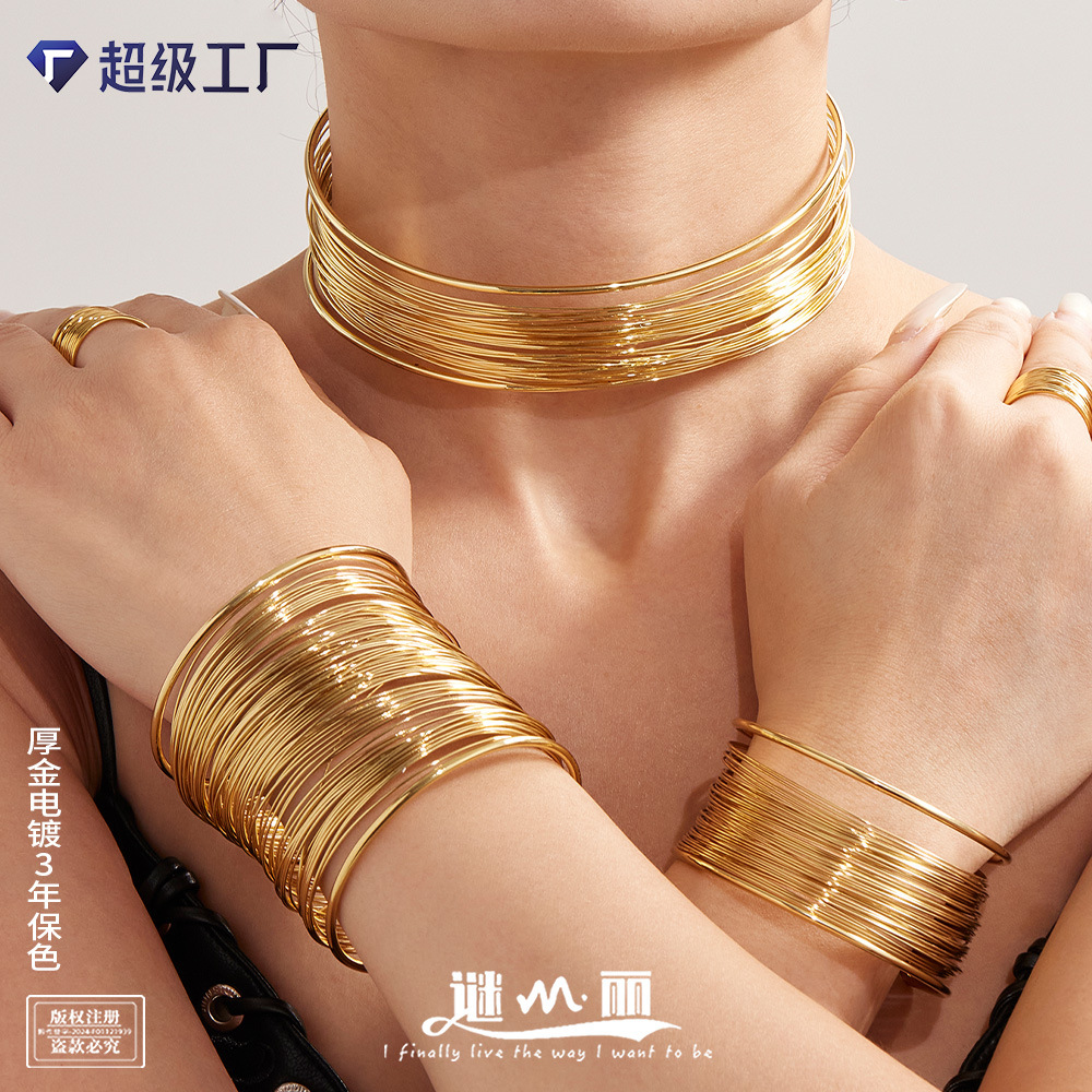 Mili 18K Real Gold Plated Hand-Wound Brushed Choker Bracelet Ring European and American Exaggerated Stainless Steel Jewelry Set