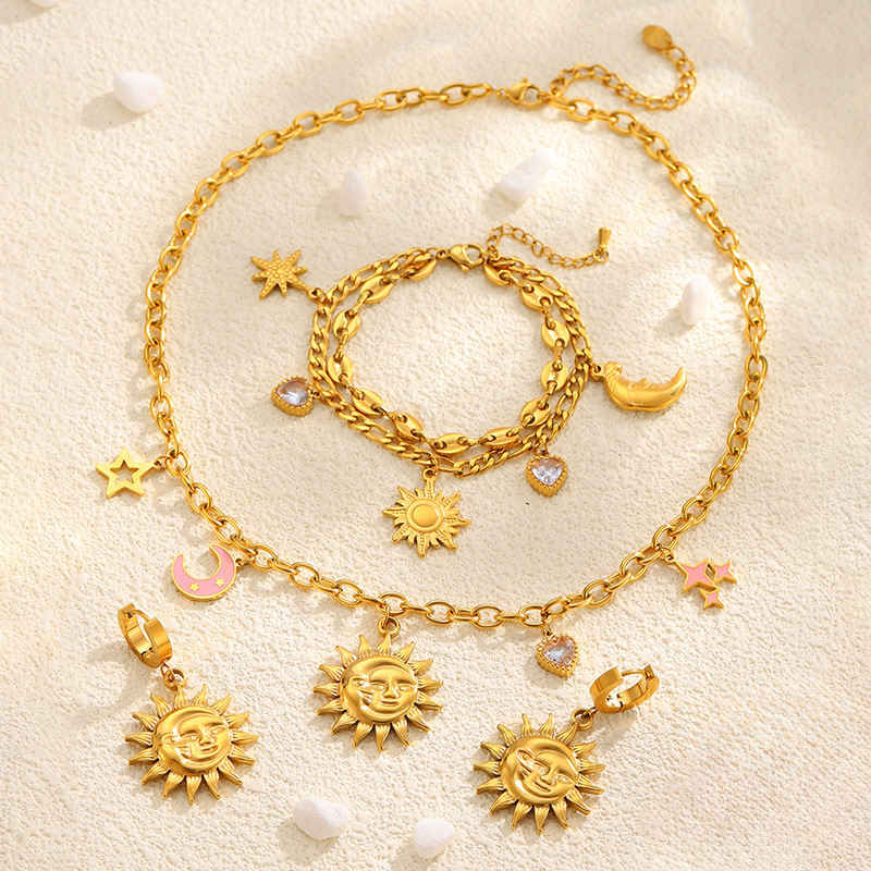 Cross-Border High-End Sun Portrait Titanium Steel Necklace Bracelet Earrings Women's Light Luxury Niche Stainless Steel Jewelry Set