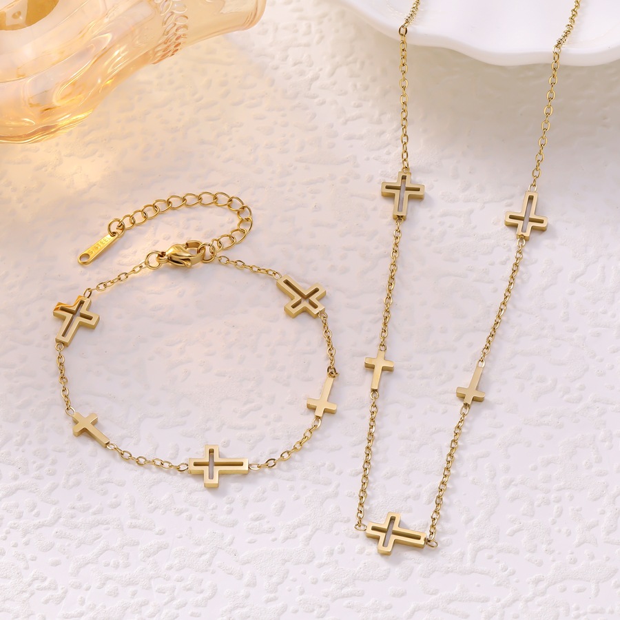 European and American Cross-Border New Hollow Cross Pendant Bracelet Necklace Set Light Luxury Versatile Trendy Stainless Steel Jewelry