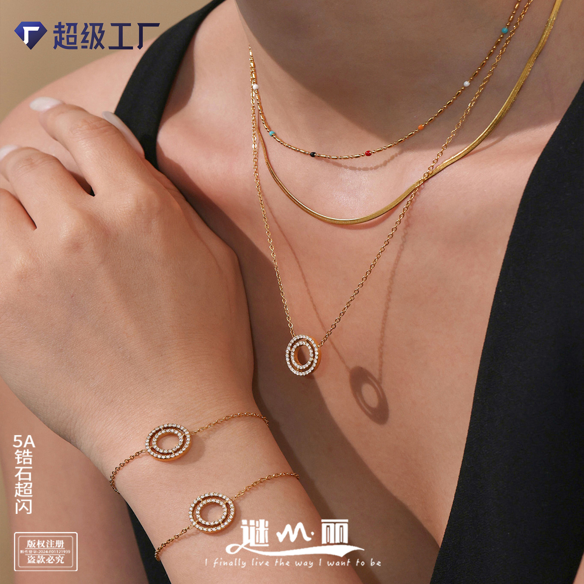 Mili Super Flash 5A Zircon Circle Pendant Clavicle Necklace Bracelet Ins Niche Design Stainless Steel New Set