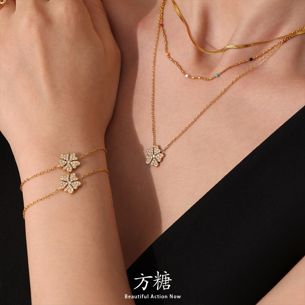 Sugar Cube Elegant Five-Leaf Flower Inlaid Zircon Necklace Bracelet Titanium Steel Pvd Vacuum Electroplating Non-Fading Set Jewelry