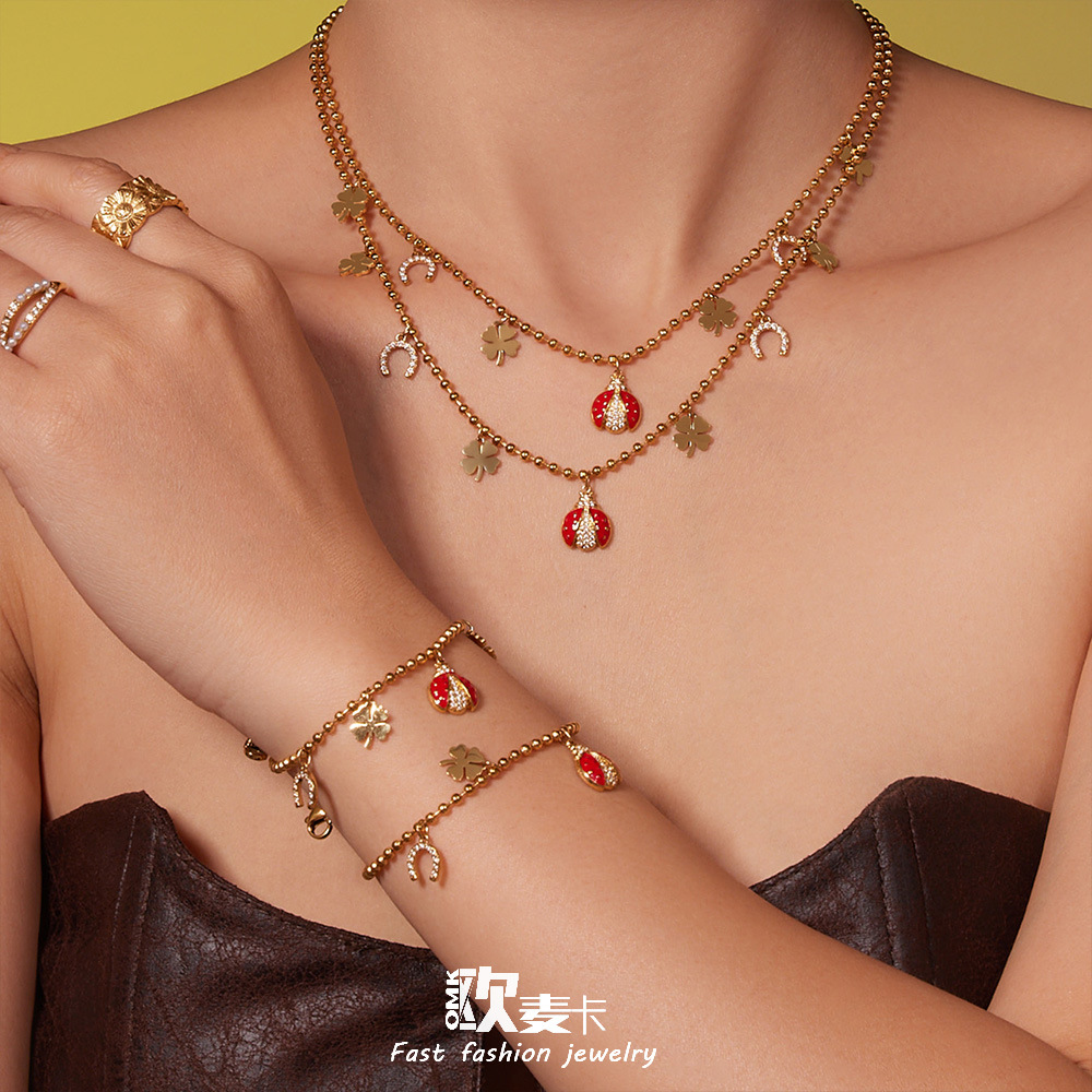 Omacar Stainless Steel 5A Zircon Oil Drop Seven-Star Ladybug Multi-Accessories Pendant Necklace Bracelet Earrings Anklet Set