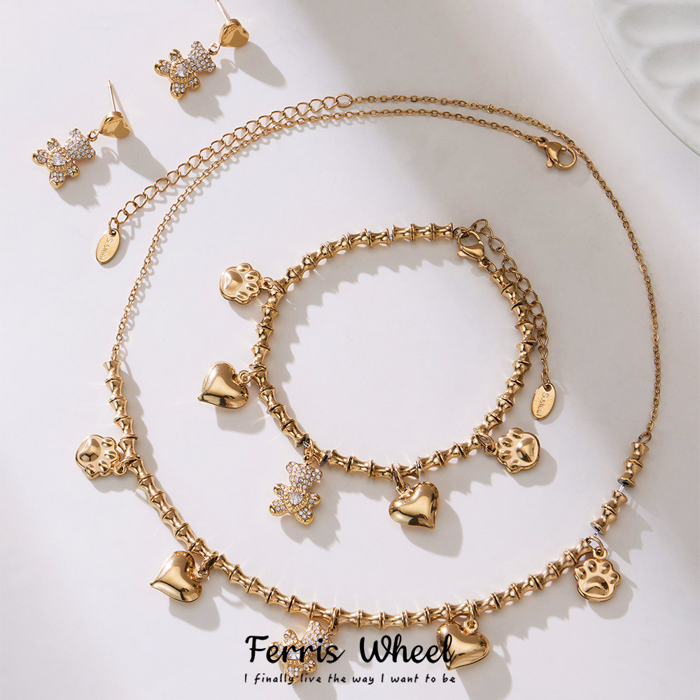 Stainless Steel Hollow Love Diamond Bear Earrings Necklace Full of Exquisite Luxury Temperament Fashion Ladies Jewelry Set Wholesale