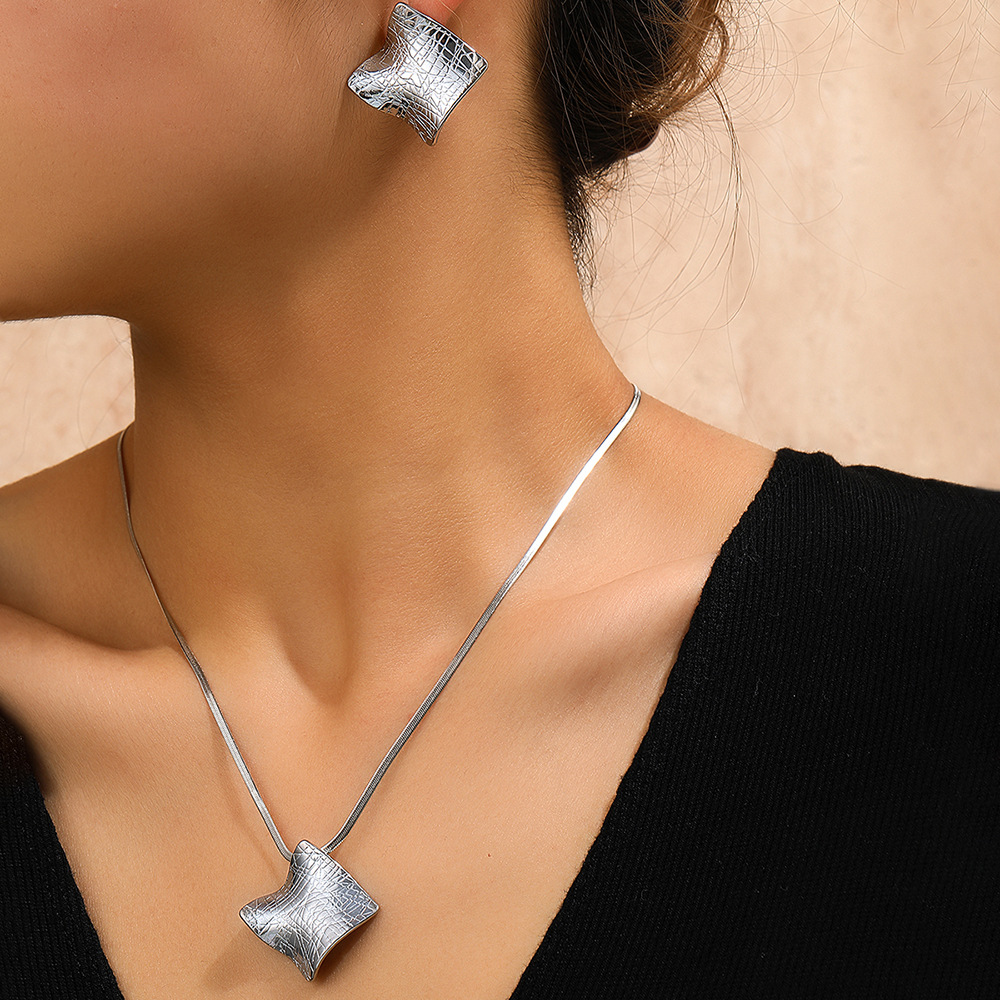European and American Ins Style New Niche Square Pleated Design Women's High Grade Titanium Steel Stainless Steel Earrings Necklace suit