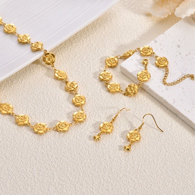 Cross-Border 18K Real Gold Rose Necklace Bracelet Earrings Set Accessible Luxury Titanium Steel Jewelry Birthday Gift