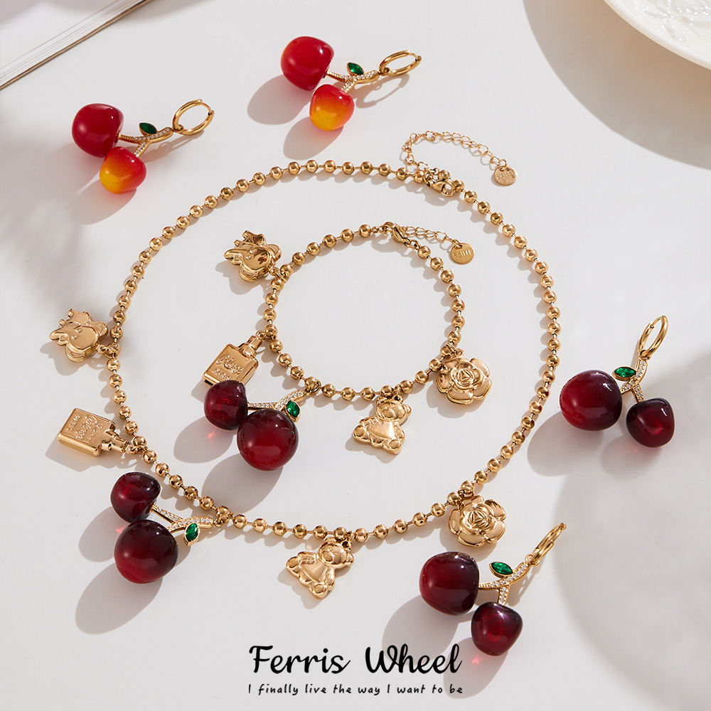 Ferris Wheel Stainless Steel DIY Pendant Necklace Bracelet Cherry Zircon Earrings Set Plated 18K Real Gold Jewelry