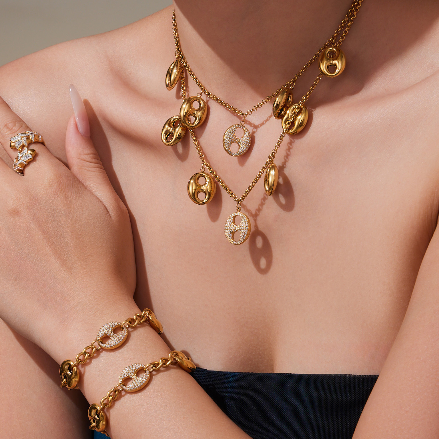 Xinyixinxin Cross-Border European and American Pig Nose Buckle Inlaid Zircon Pendant Clavicle Chain Stitching Bracelet Niche Design Jewelry Set