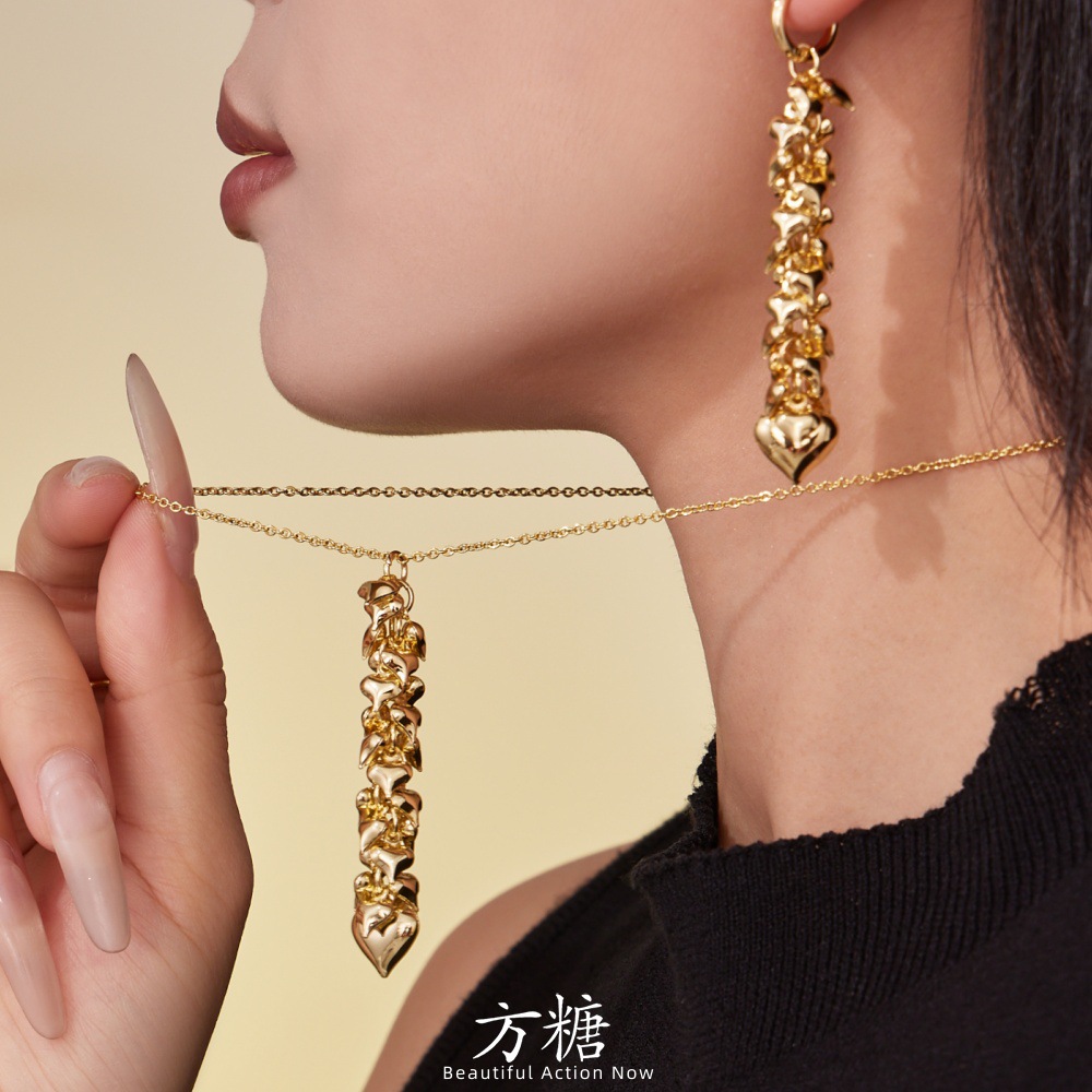 Sugar Cube Korean Fashion Creative Heart Tassel Earrings Necklace Set for Women, Stainless Steel Plated Jewelry Accessories