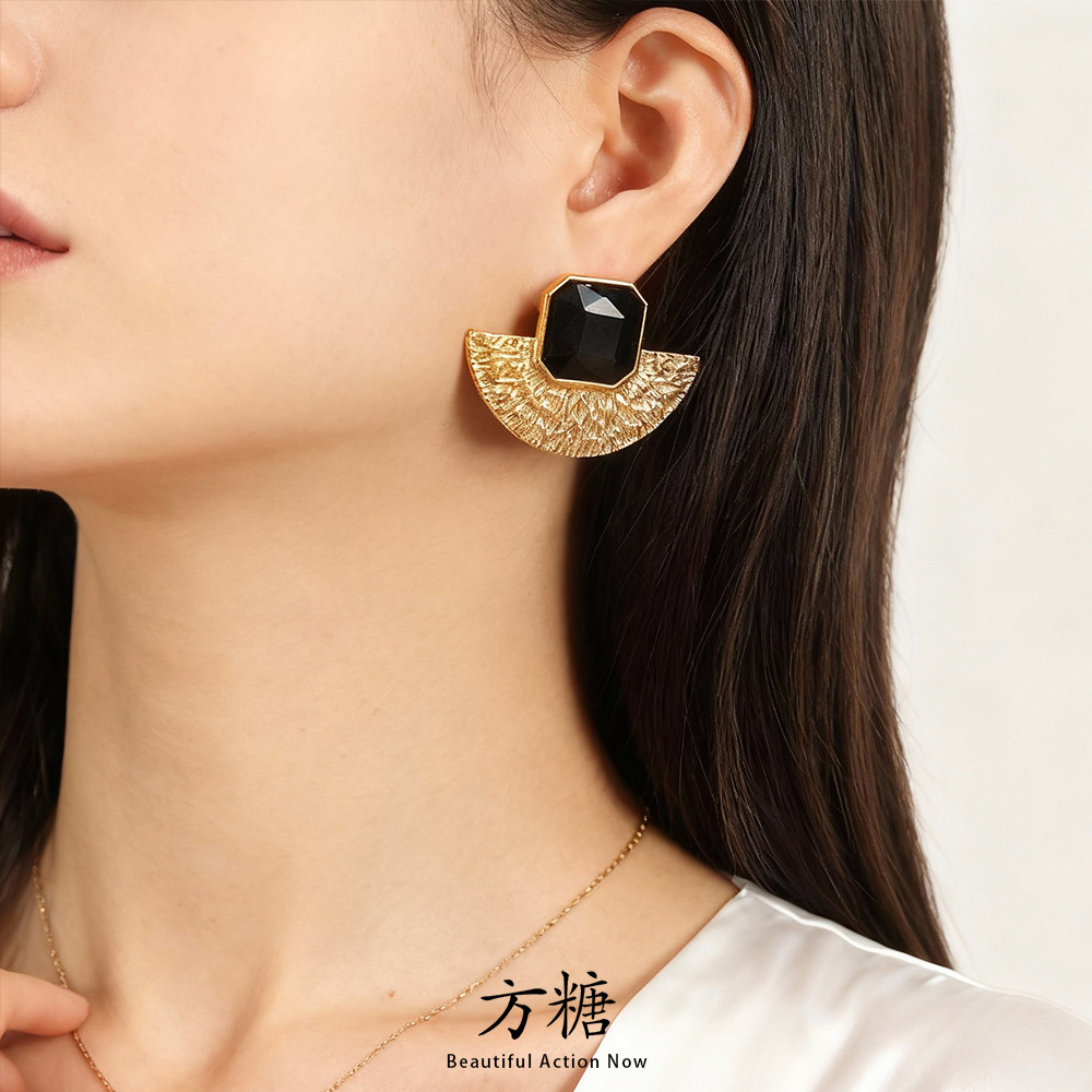 Stainless Steel Plated 18K Real Gold Fan-Shaped Texture Glass Stone Earrings Necklace Women's Exquisite Elegant Design Set Decoration