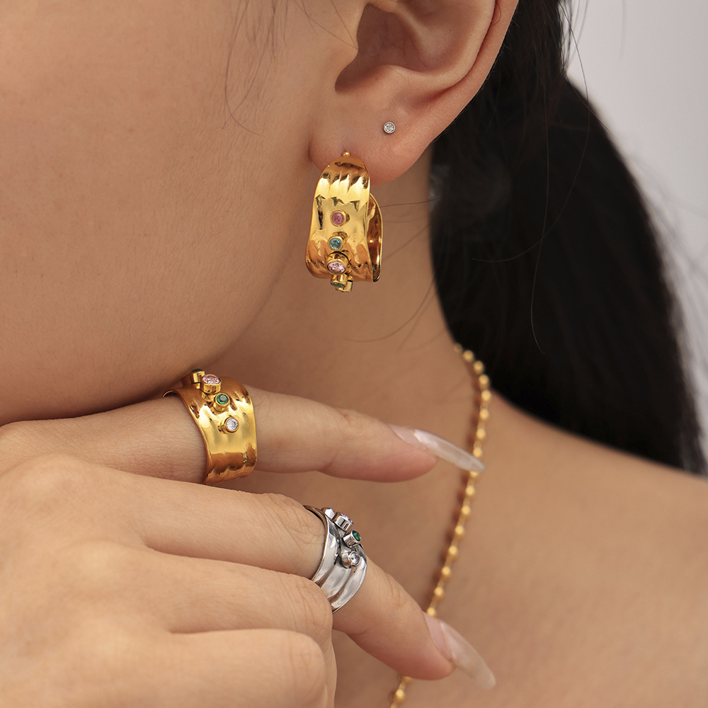 Oumeca European and American Mixed Color Zircon Open Ring C Earrings Stainless Steel Plated 18K True Gold Color Preservation Jewelry suit
