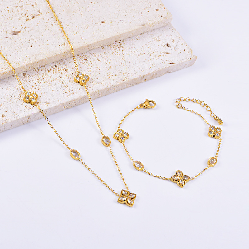 Korean Style Light Luxury Diamond-encrusted Four-leaf Flower Necklace Oval Zircon Stainless Steel Bracelet All-match suit Women Cross-border Wholesale