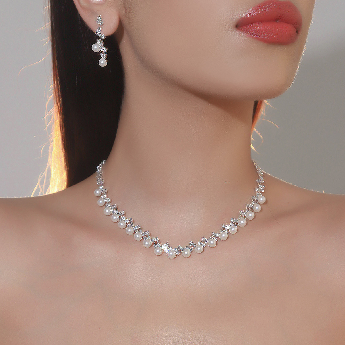 European and American High-end Luxury Super Flash Diamond Pearl Necklace Earrings suit Bridal Jewelry Two-piece Wedding Accessories