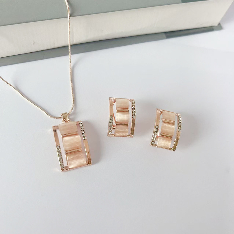 Cross-border New Diamond-encrusted Trendy Plaid High-end Light Luxury Long Square Cat's Eye Necklace Earrings Two-piece Set