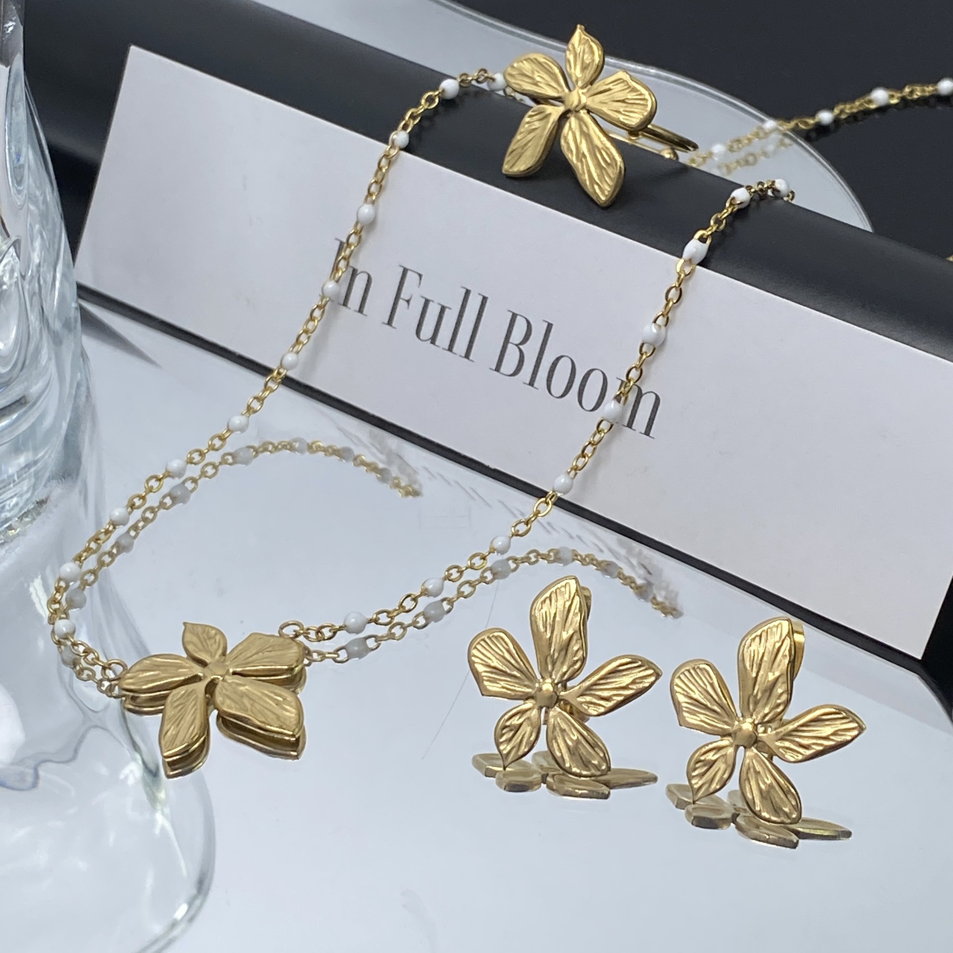 European and American Ins Style Three-petal Flower Inlaid with Imitation Pearl Ring Earrings Trendy Temperament Stainless Steel Gold Plated Jewelry suit