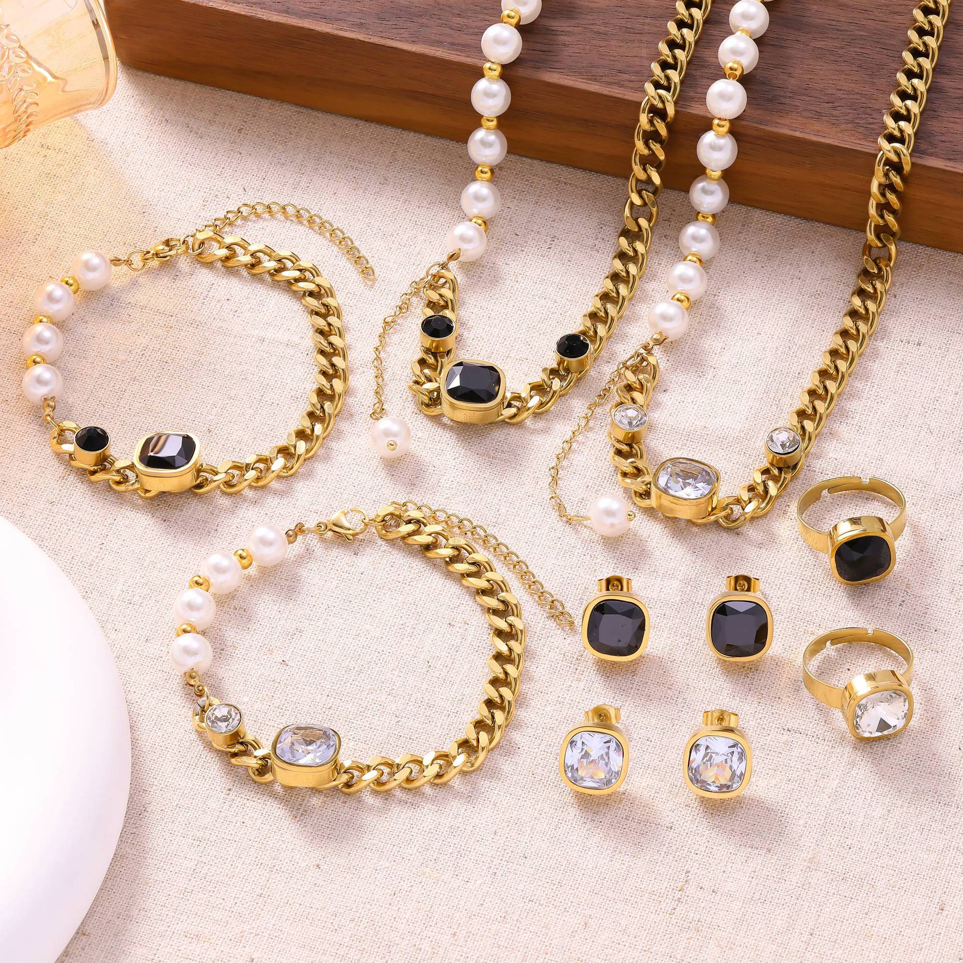 Cross-Border Popular European and American Hot-Selling Zircon Pearl Stainless Steel Cuban Chain Set Decoration Accessories Titanium Steel Jewelry