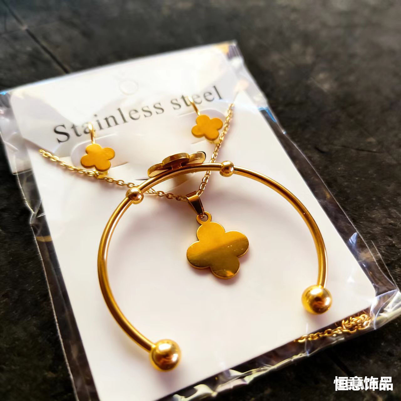 Children's Golden Four-Leaf Clover Simple Elegant Stainless Steel Fashionable Stylish Versatile Accessible Luxury Earrings Necklace Bracelet Set
