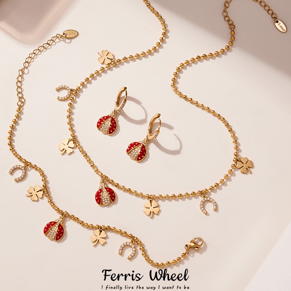 Ferris Wheel French Retro Oil Dripping Red Full Diamond Ladybug Necklace Bracelet Earrings Accessible Luxury Jewelry Set for Women