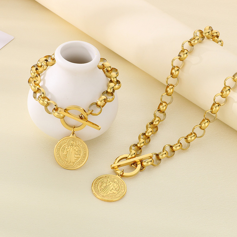 Stainless Steel Ot Buckle Pure Thick Chain Necklace Bracelet Set European and American Neutral Hip-Hop Exaggerated Jewelry Plated with 18K Real Gold