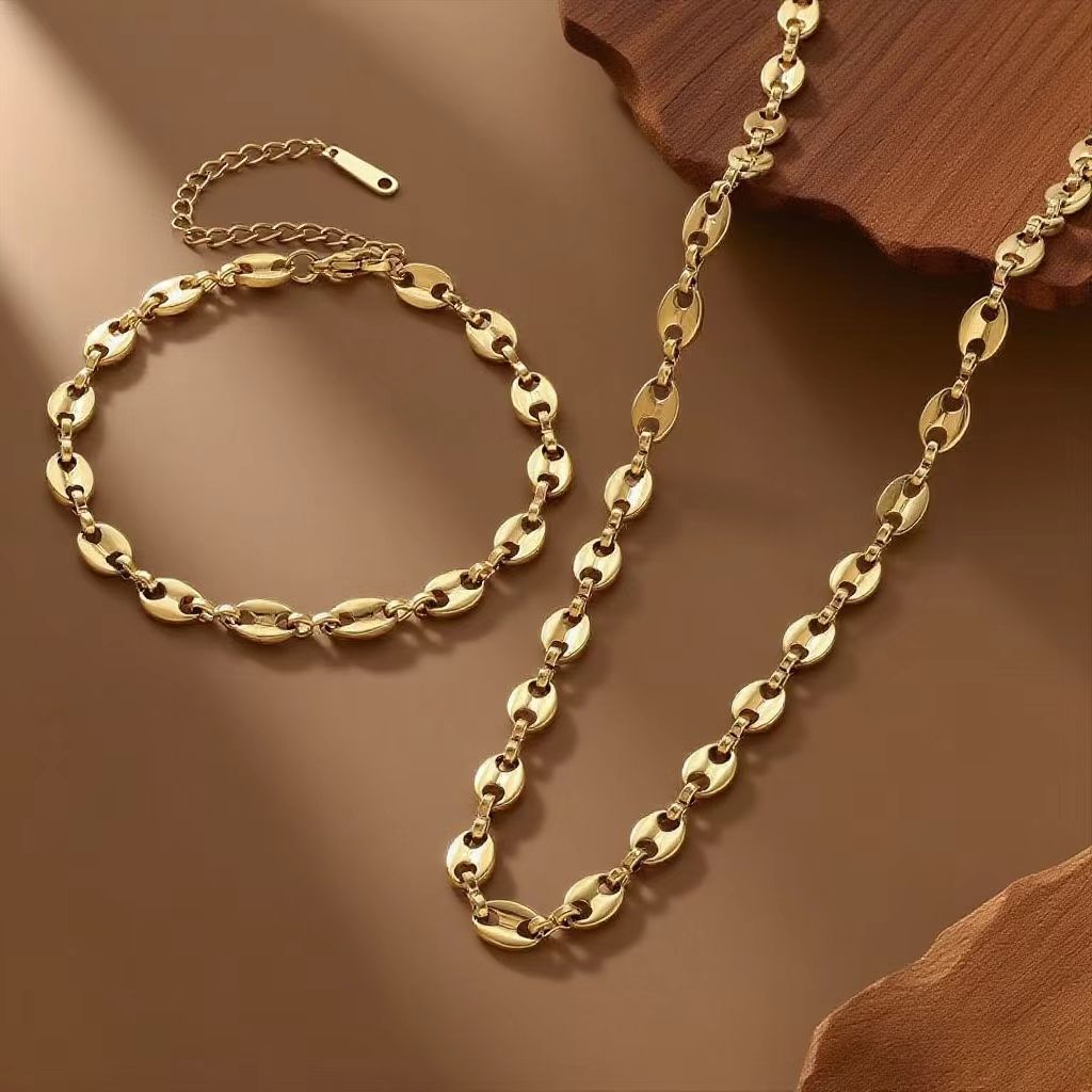 New Coffee Bean Pig Nose Stainless Steel Necklace Bracelet Set Feminine Light Luxury Niche Versatile Jewelry Wholesale