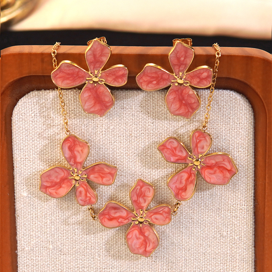 European and American Cross-Border Oil Dripping Flower Necklace and Earrings Set, Simple and Versatile Stainless Steel Flower Necklace Jewelry