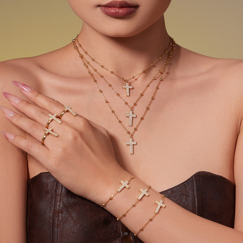 Stainless Steel Cross Zircon Necklace Earrings 18K Gold Plated European and American Chic Style Accessible Luxury Versatile Jewelry Set