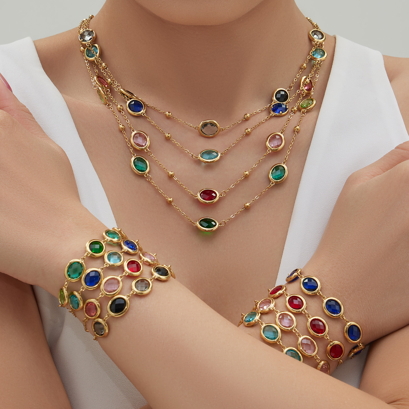 Stainless Steel Faceted Stained Glass Stone Exquisite Earrings Small Stacked Necklace Bracelet Jewelry Set Plated with 18K Gold