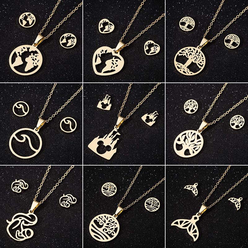 Stainless Steel Jewelry suit Gold Earrings Necklace Accessories Three-Piece Set Butterfly Flower Crown Pattern Pendant Earrings