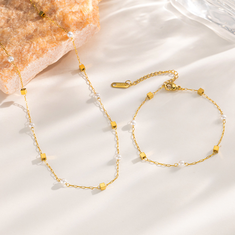 French High-End Exquisite Small Square Pearl Titanium Steel Necklace Women's Fashion Light Luxury Versatile Clavicle Chain New Set