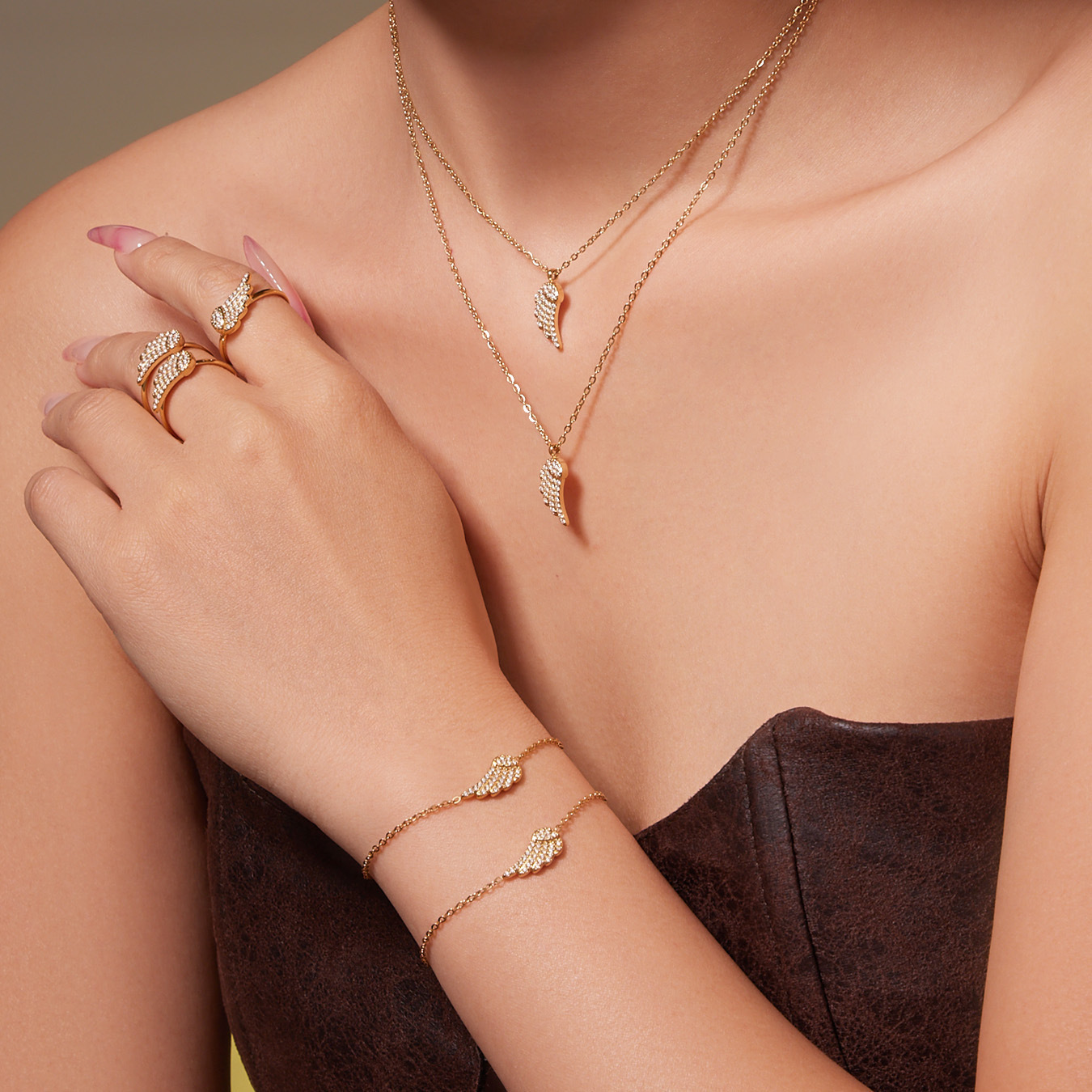 Omaca Super Flash 5A Zircon Small Wings Shape Bracelet Necklace Earrings Ring Set Stainless Steel Plated 18K Gold