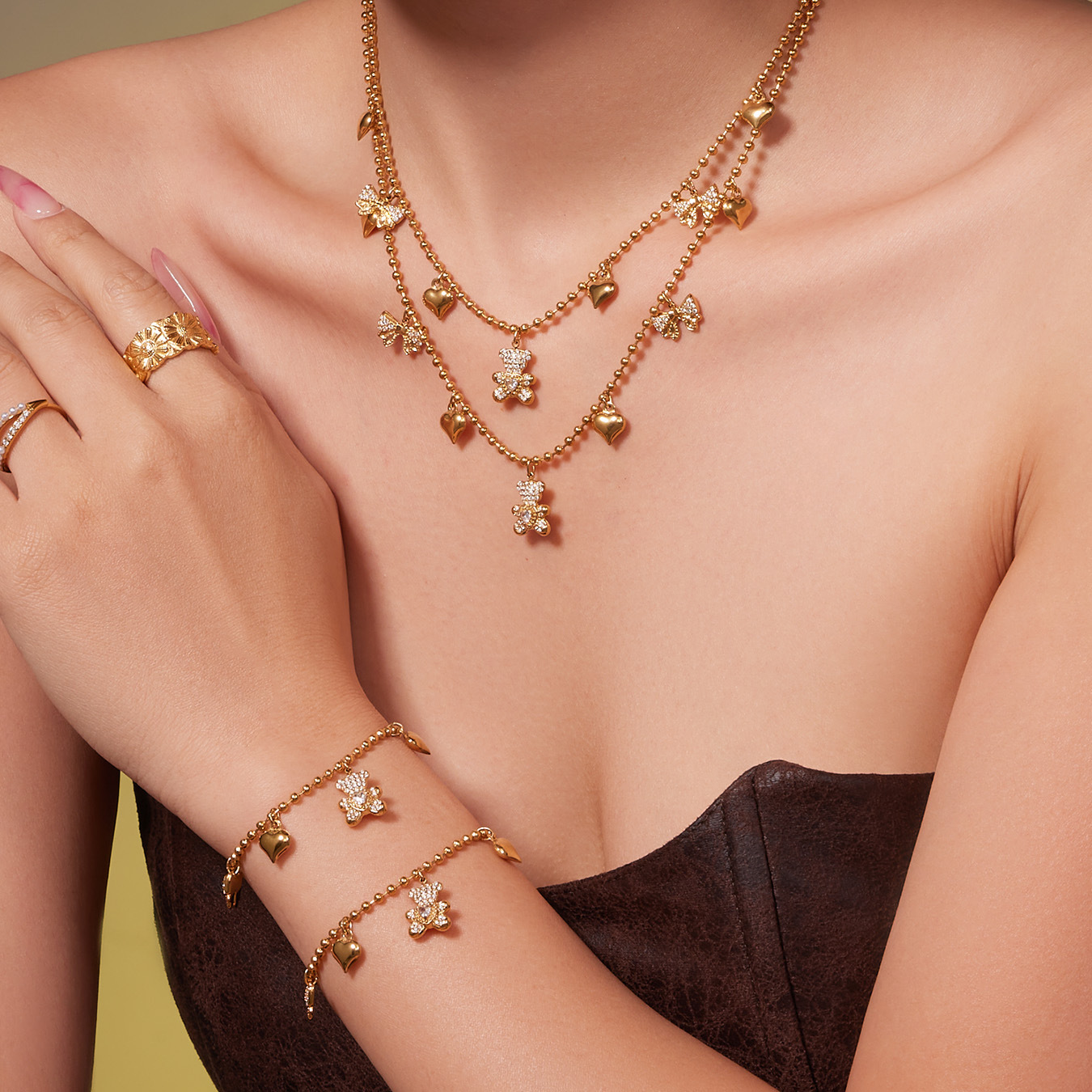 Stainless Steel 5A Zircon Full Diamond Bear Bow Heart Multi-Accessory Pendant Necklace Bracelet Earrings Jewelry Set