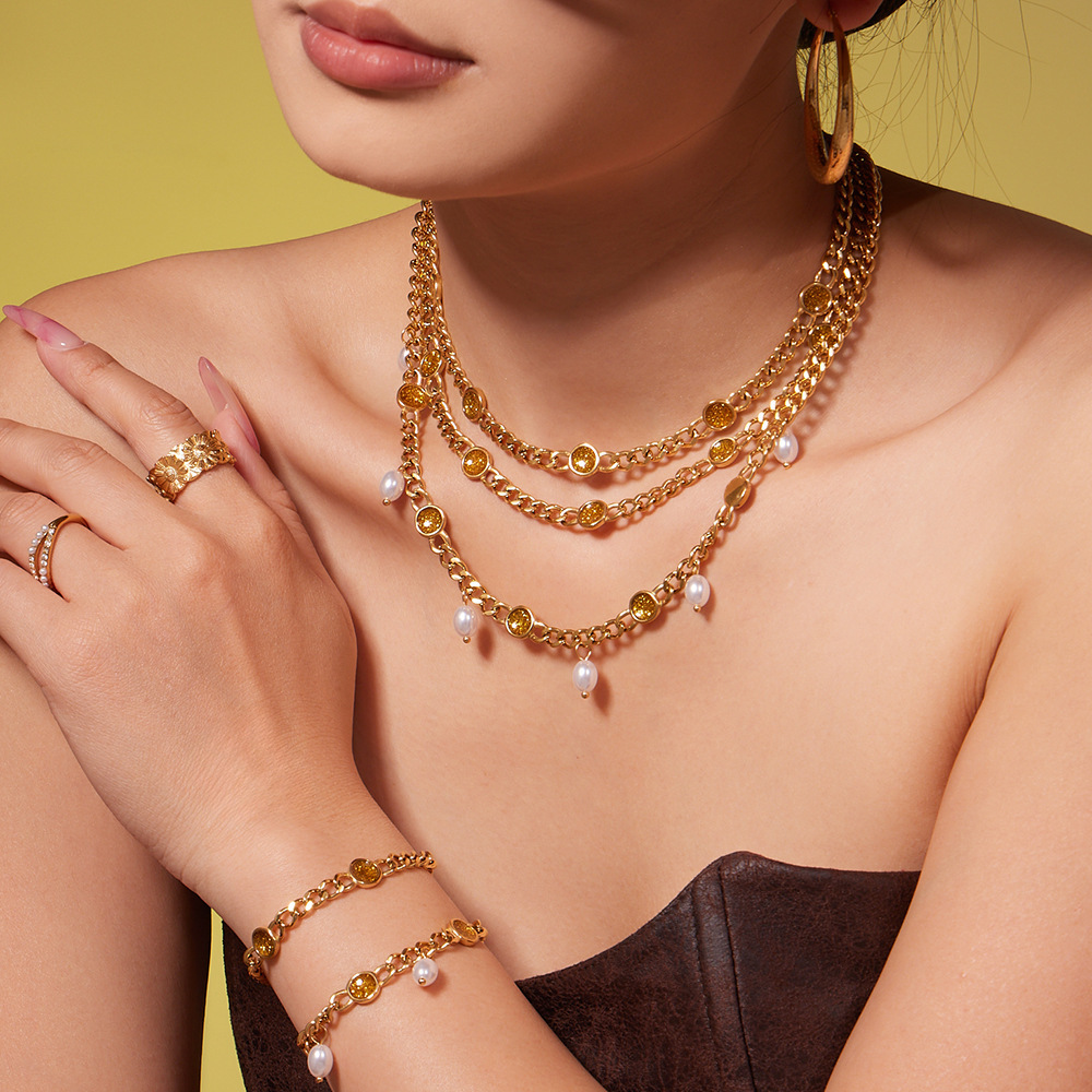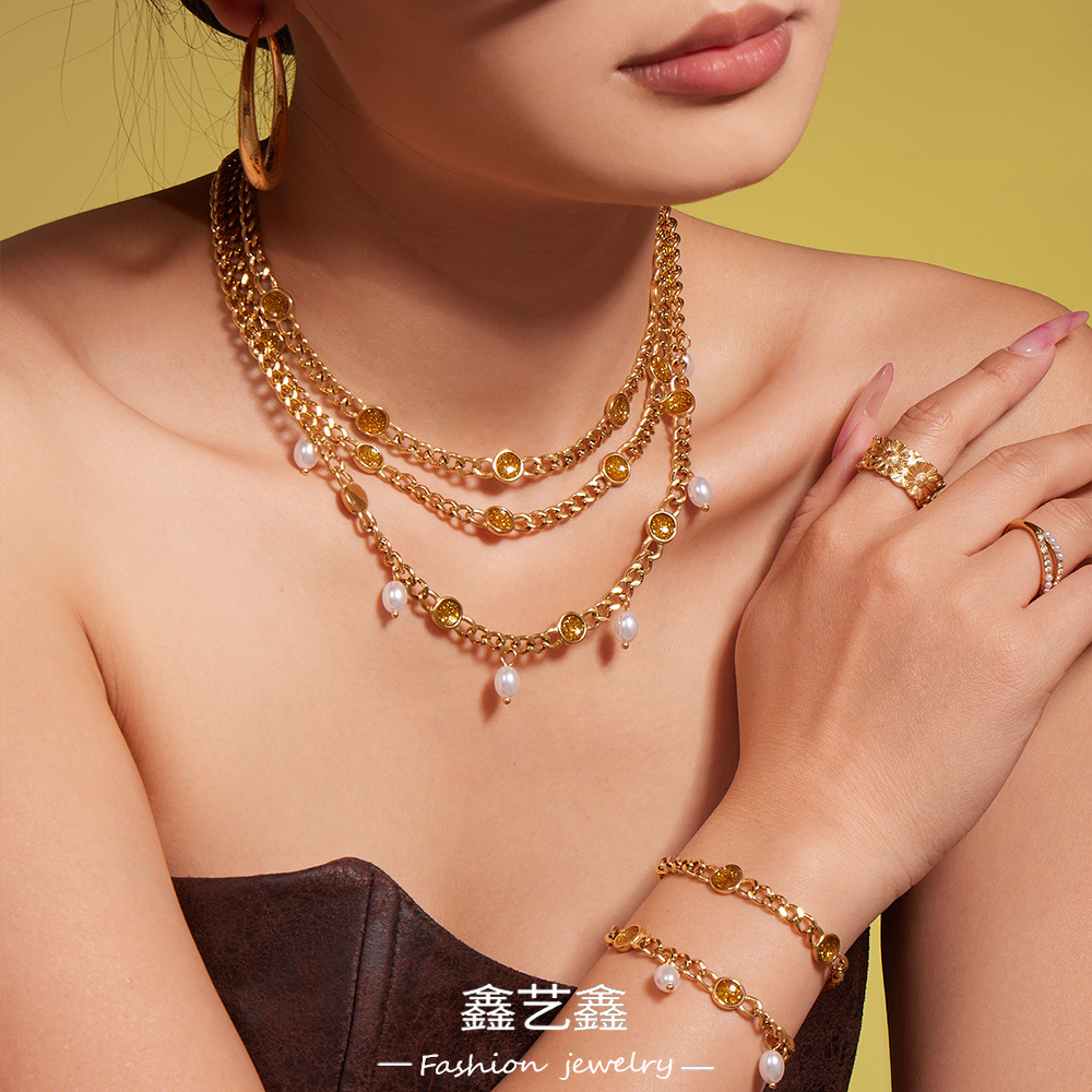 European and American Best-Selling Imitation Pearl Tassel Necklace Bracelet Stainless Steel Plated 18K Gold Ins Niche Design Jewelry Set