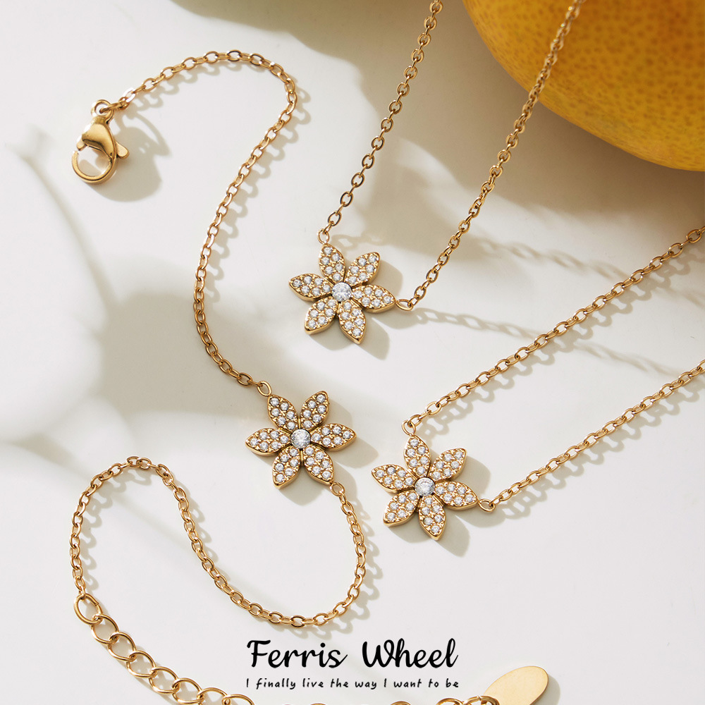 Miduoduo Simple and Fashionable Flower Full Diamond Zircon Pendant Double Layer Necklace Stainless Steel Bracelet Ring Set